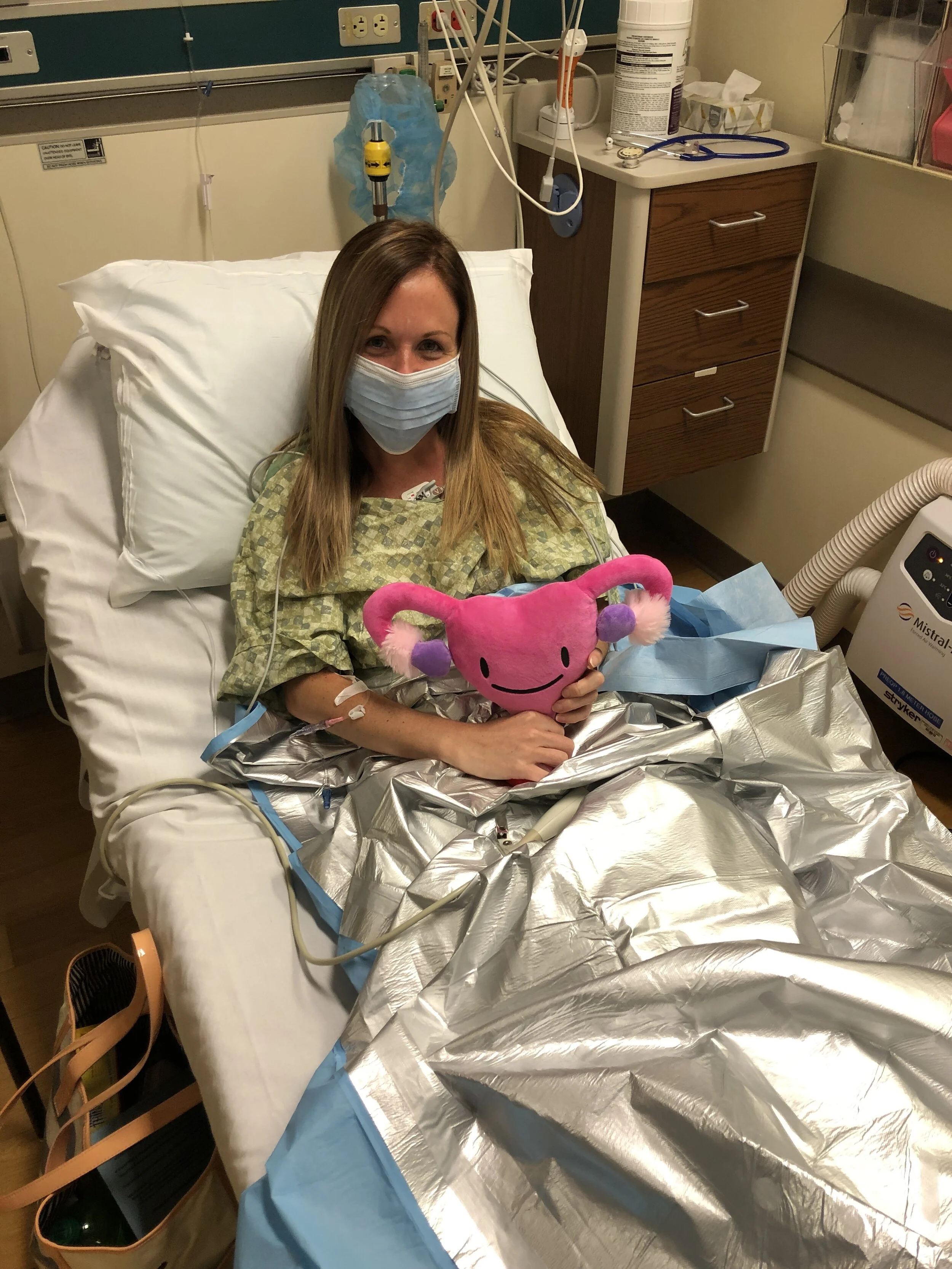 Surgery lasted around an hour and a half. As soon as the surgery was over. Dr Coussons went out to talk to Kory and tell him about the surgery. He told Kory that everything was a success. He was able to locate and remove the septum in my uterus. The balloon filled with saline attached to a catheter was inserted in to my uterus. This was to make sure the uterus stayed open and didn’t stick together while it was healing. He also successfully placed the trans abdominal cerclage right at the top of my cervix, right below the uterus. He told Kory that my cervix was very short, and definitely incompetent. It was a great decision to have the cerclage placed. With that cerclage, we are hopeful that we will now be able to hold a future pregnancy to full term. The doctor checked my right tube with fluid and could see that it was still open and my ovary looked good. He did notice that they almost looked twisted or pushed back. He moved my right fallopian tube and ovary forward. He mentioned to Kory, that could be helpful when trying to get pregnant. Kory got to see all the pictures that the doctor took as well. Kory was then taken back to the original waiting area, and had to wait for me to wake up from surgery.